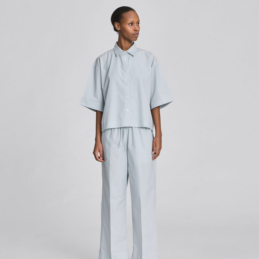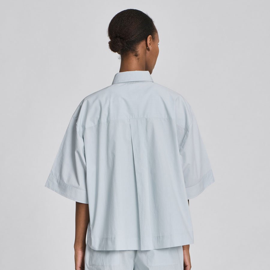 Skjorten har desuden bærestykke midt bagpå og en cropped, oversized pasform – den smukke, lyseblå nuance, der liver op i enhver garderobe!
