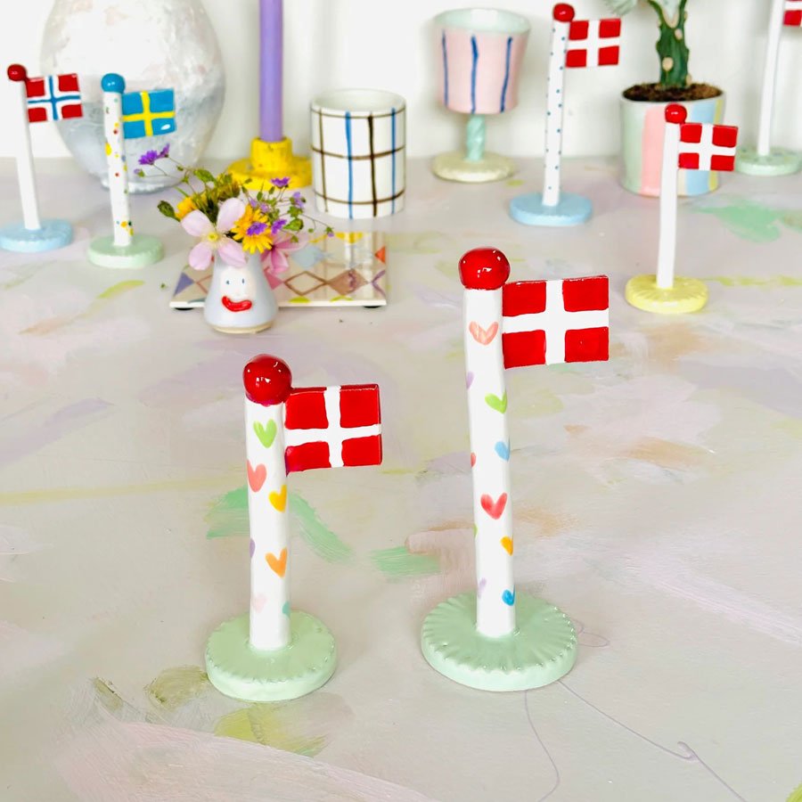 Flaget er håndlavet og hånddekoreret og det flag du modtager, vil ligne det på billedet, men der kan sagtens være små afvigelser i form, farve og størrelse.