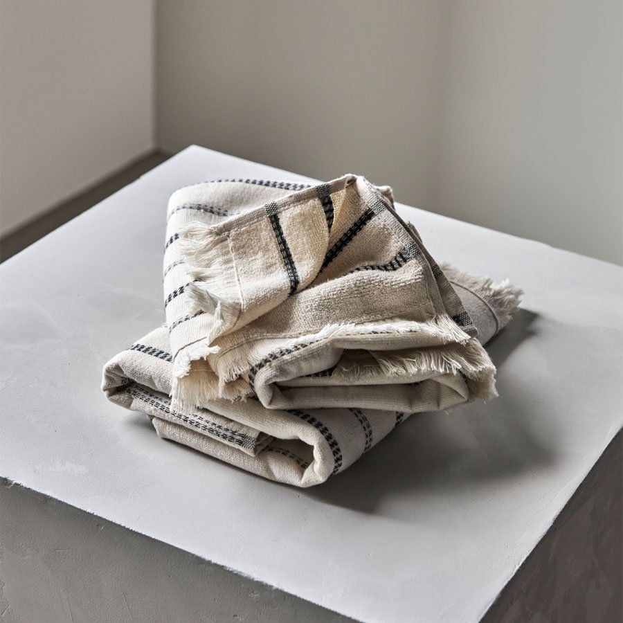 Her får du to stk luksuriøse hammam-håndklæder i tidløs råhvid med elegante sorte striber. De bløde håndklæder med dekorative frynser giver et strejf af spa-luksus på dit badeværelse, mens den høje sugeevne sikrer optimal funktionalitet i hverdagen.