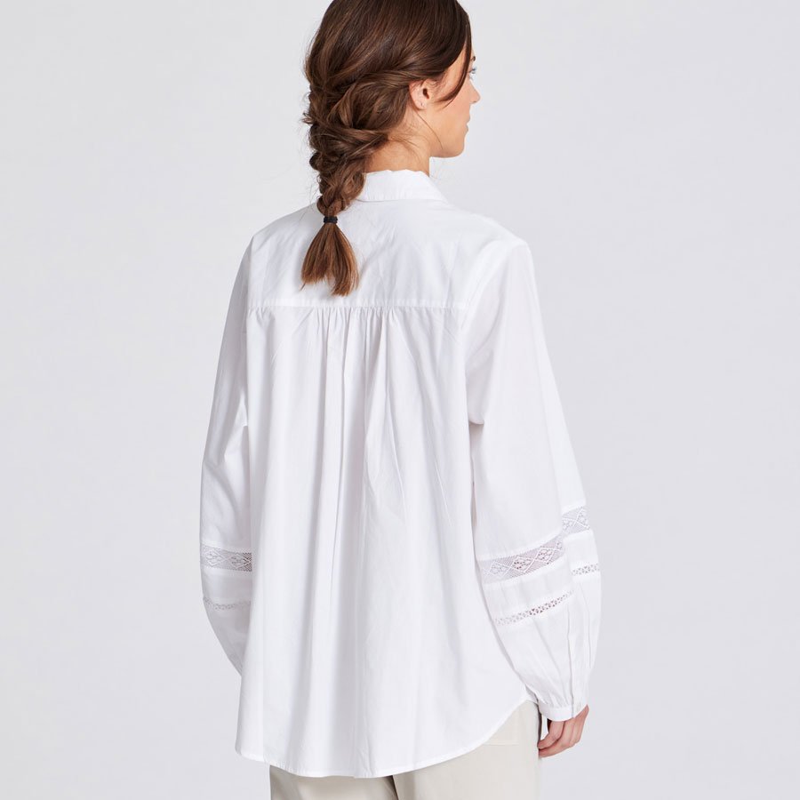 Jessica er en feminin, hvid skjorte i 100% økologisk bomuldspoplin fra danske Gai + Lisva. Skjorten har smukke detaljer i form af en fin, afrundet krave, rynk bagpå samt blonder på fronten og ærmerne. Den har desuden knapper foran og på manchetterne.