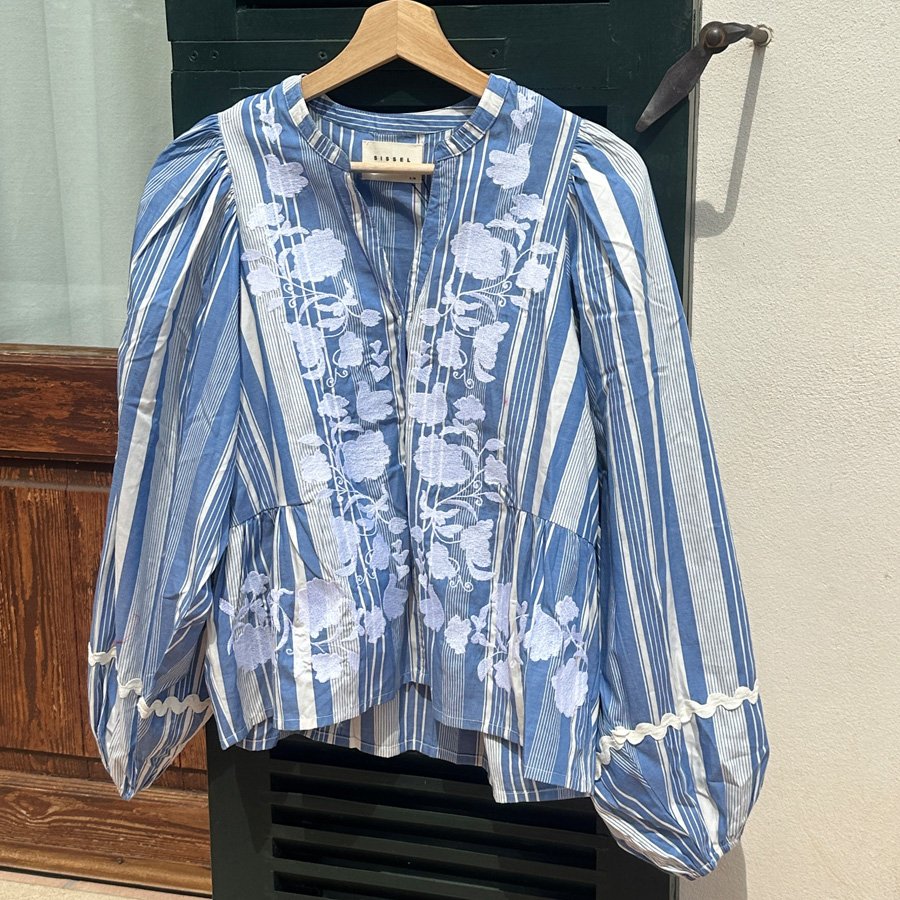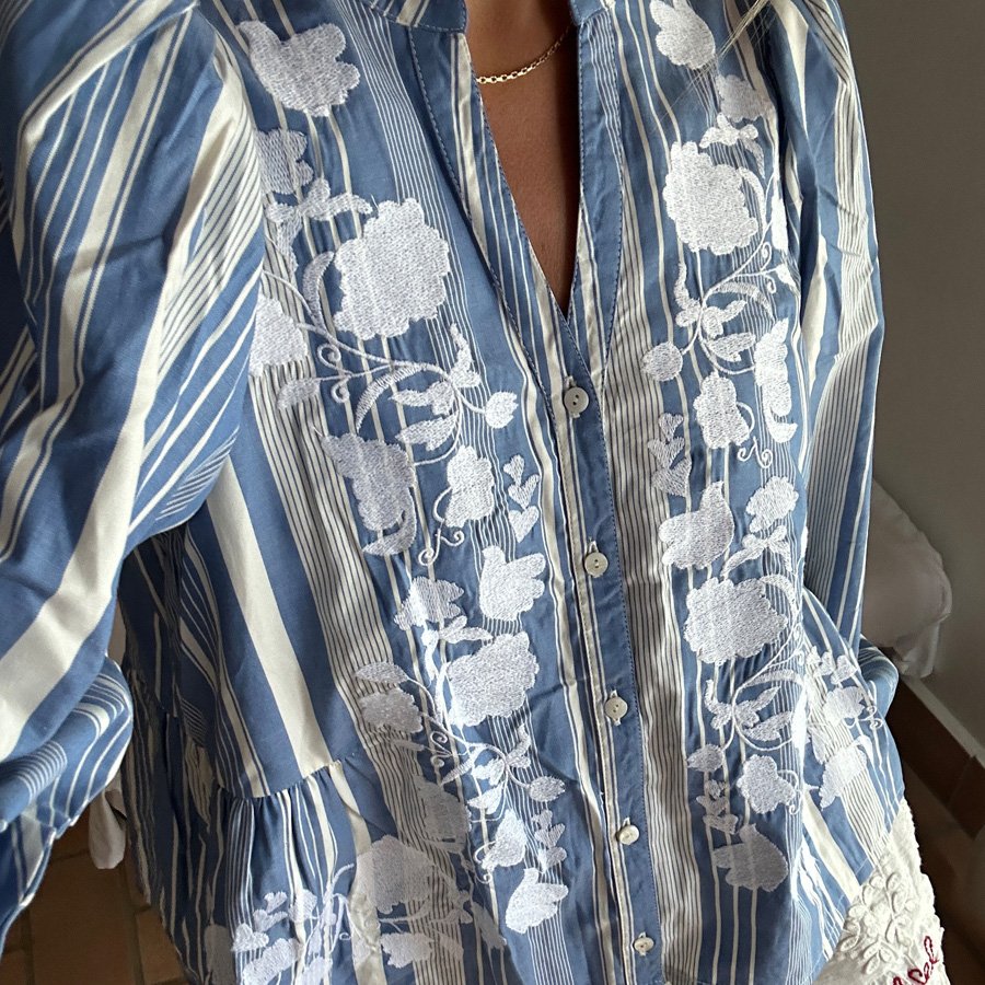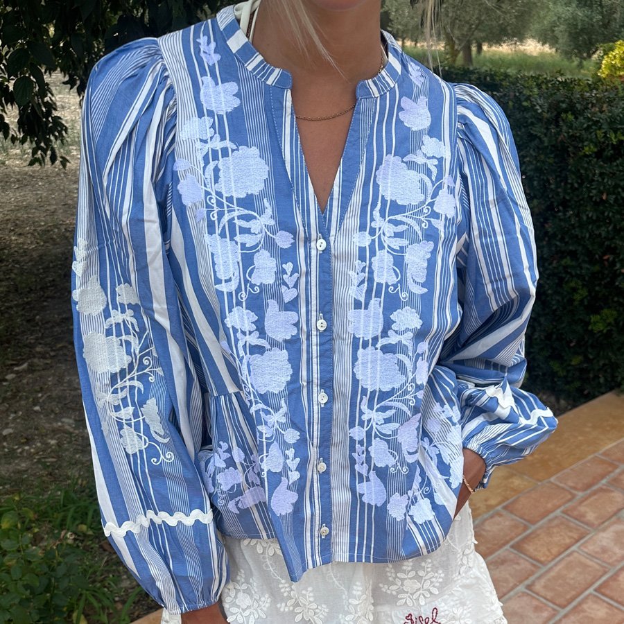 Juliane har indfarvede striber i blå og hvide toner, og er dekoreret med smukke, detaljerige broderier på blusens front og ærmer, samt zigzagbånd på ærmerne – en bluse, der let kan styles til både hverdag og fest, og som uden tvivl bliver en ny favorit i garderoben!