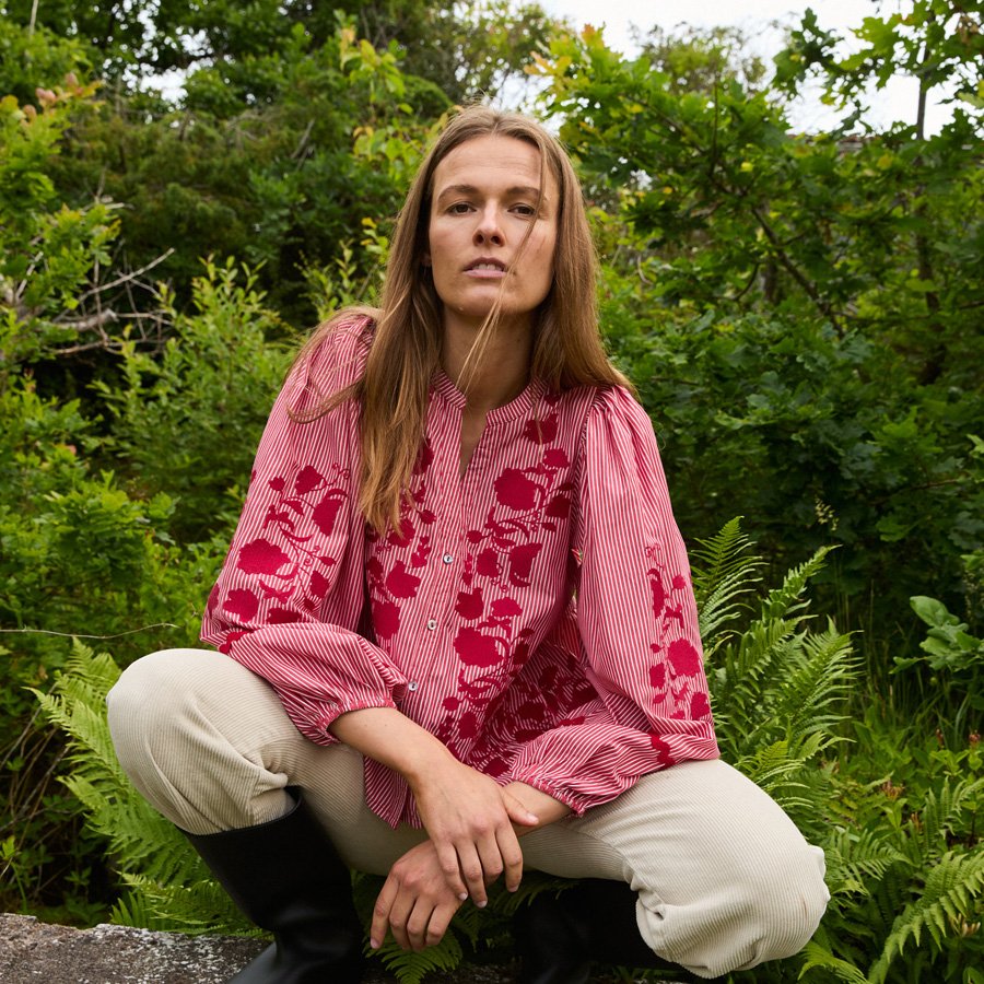 Juliane har indfarvede striber i røde og hvide toner, og er dekoreret med smukke, detaljerige broderier på blusens front og ærmer, samt zigzagbånd på ærmerne – en bluse, der let kan styles til både hverdag og fest, og som uden tvivl bliver en ny favorit i garderoben!