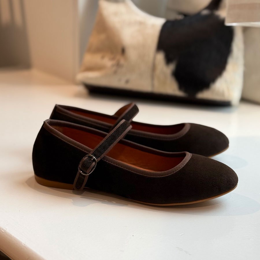 Mary Jane ballerina er lavet i blød velour, med det klassiske spænde over vristen – her i tidens hotte, chokoladebrune farve!