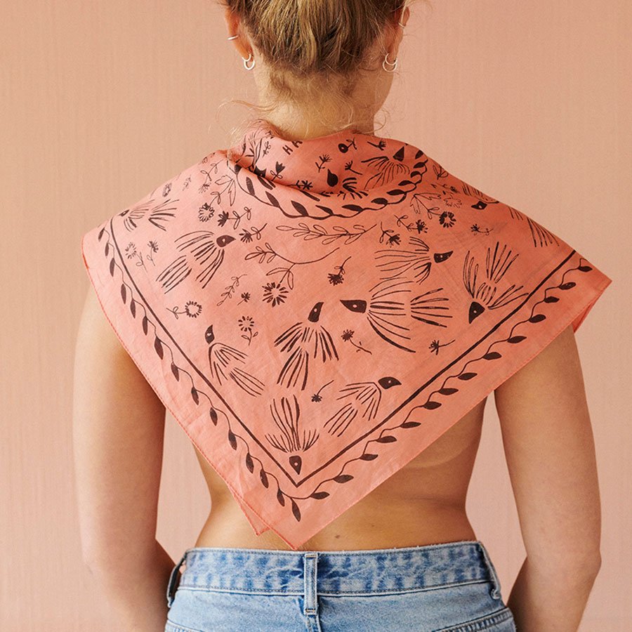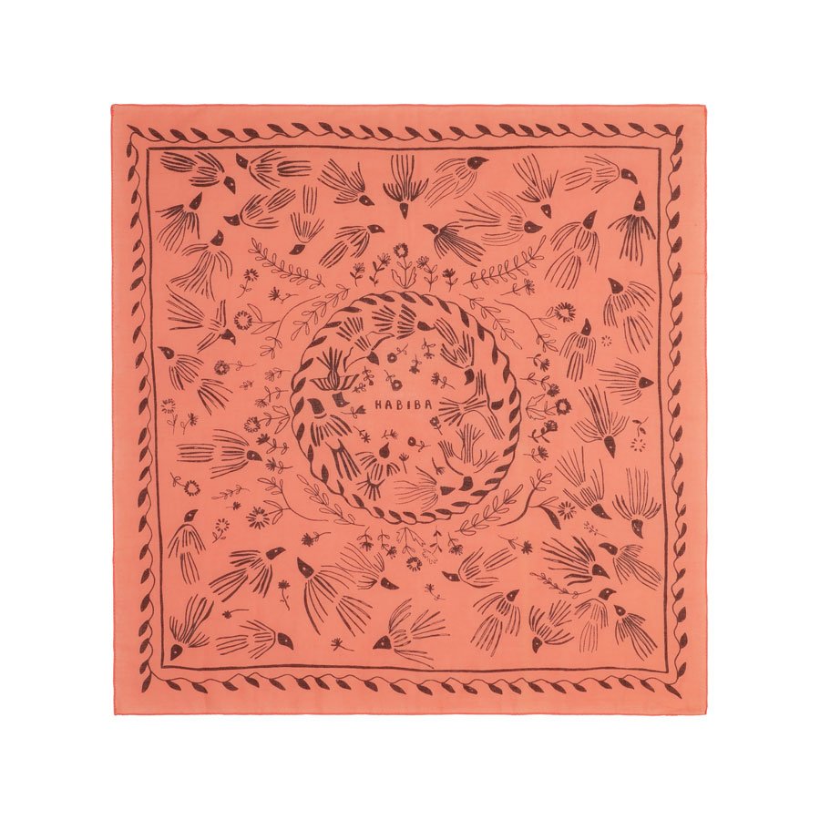 Pattie Bandanaen fra Habiba har et charmerende håndtegnet print af små fugle og fine blomster. Et skønt tørklæde, der passer til det meste og som kan styles på mange måder.
