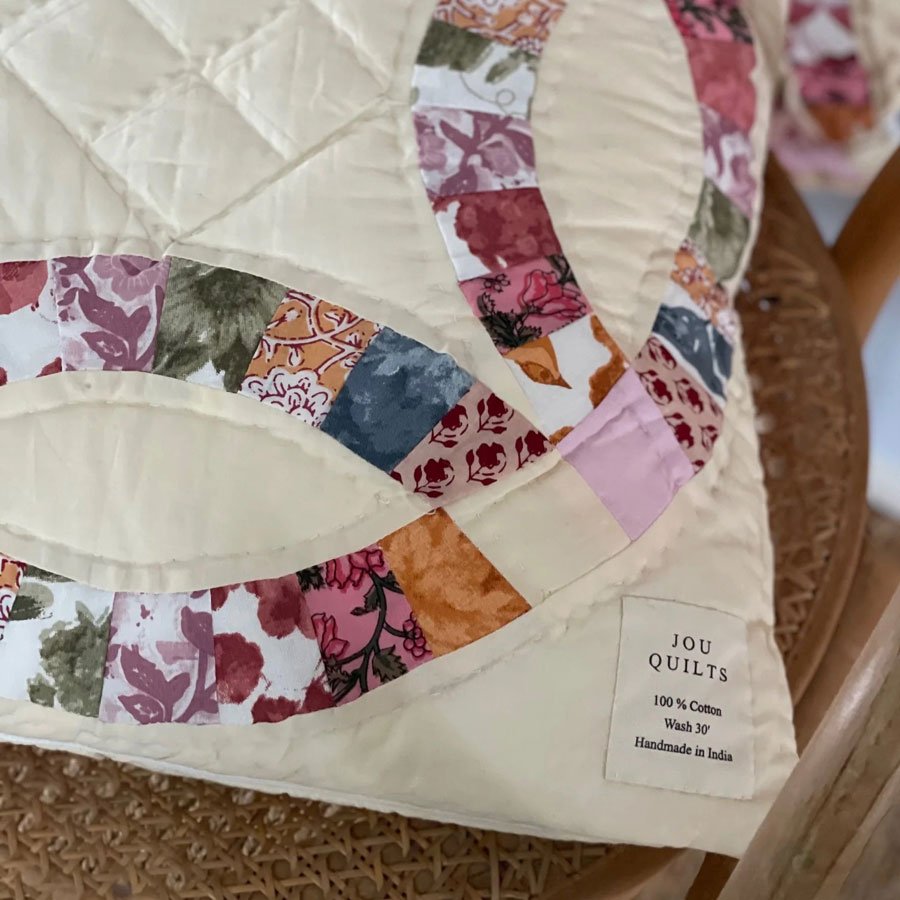 Smukt quiltet pudebetræk i patchwork mønsteret “Wedding ring” Mønsteret går helt tilbage til det 15. århundrede og symboliserer kærlighed.